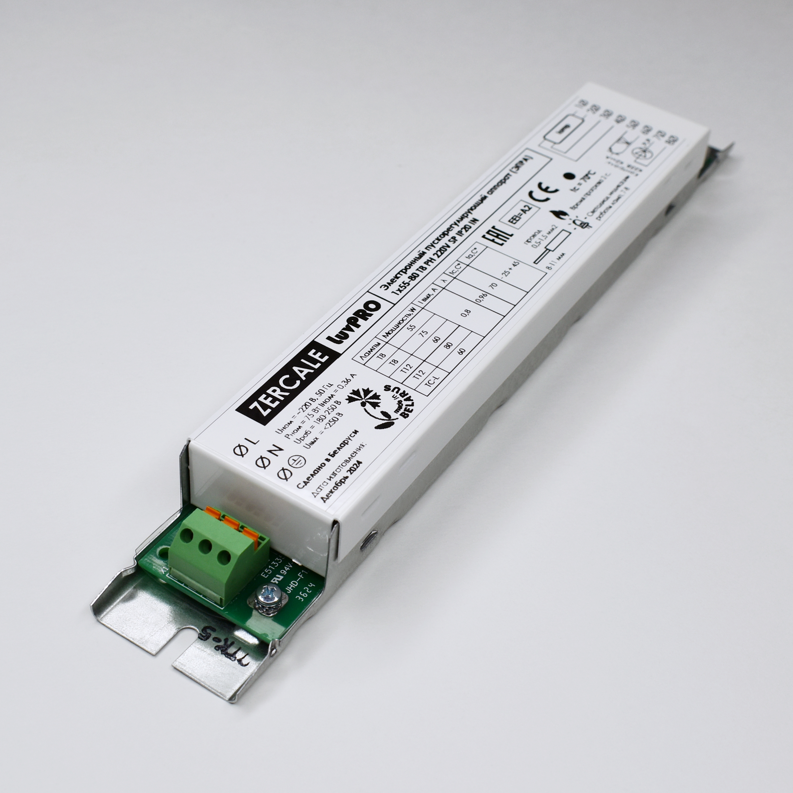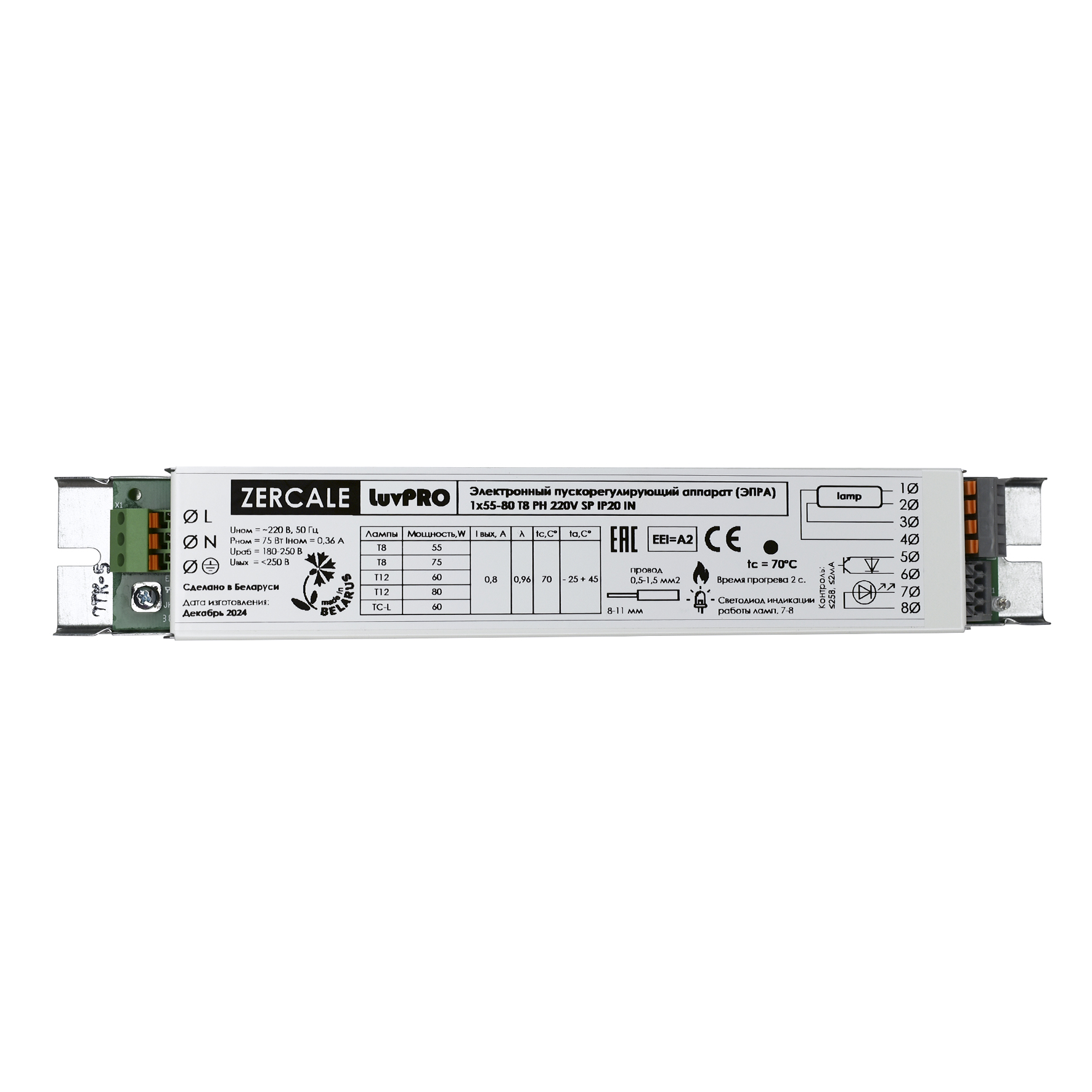 Электронный пускорегулирующий аппарат (ЭПРА) Zercale LuvPRO 1x55-80 Т8 PH800 220V SP260 IP20 IN, 260x42x29 мм, с индикацией для запуска и обеспечения рабочего режима ультрафиолетовых ламп низкого давления.