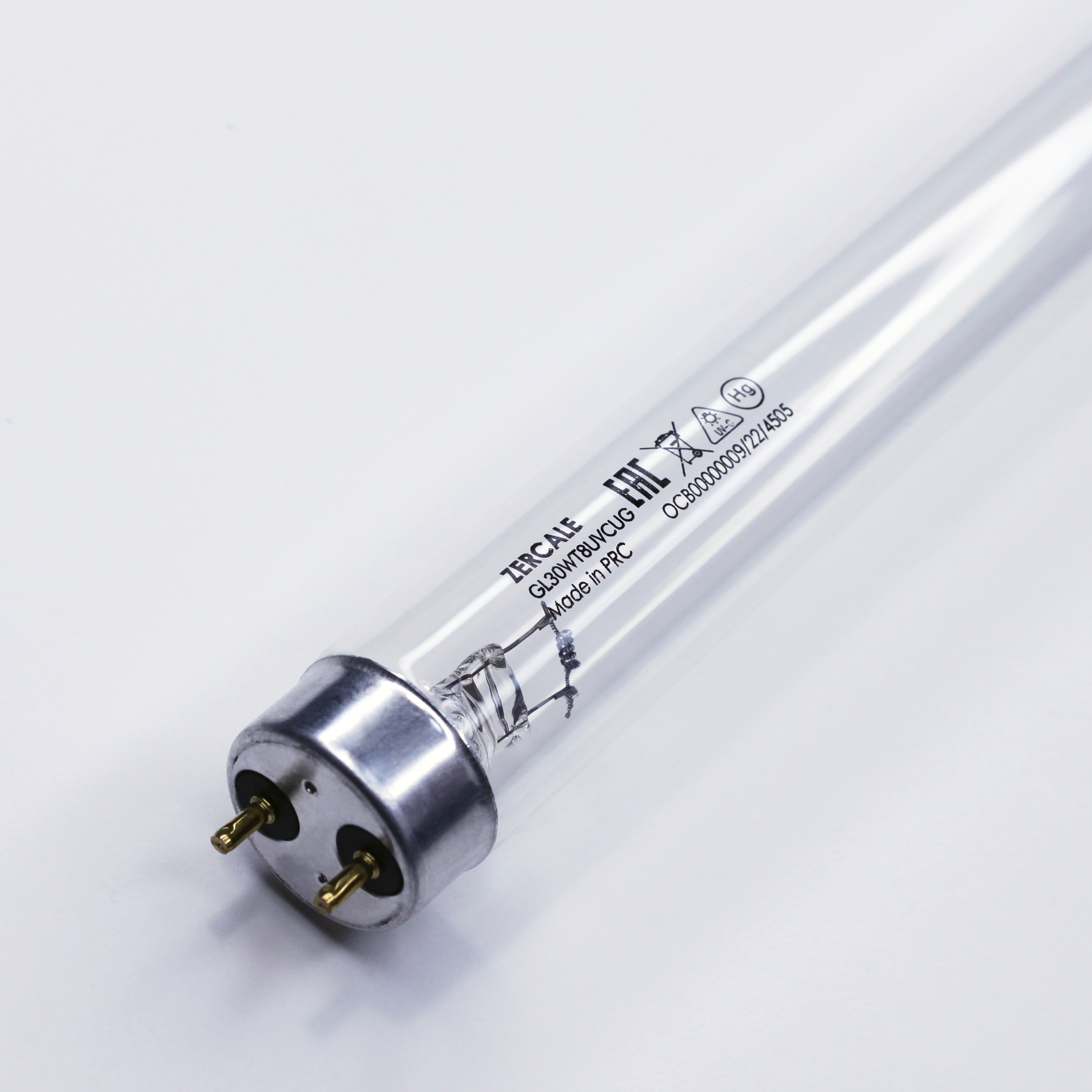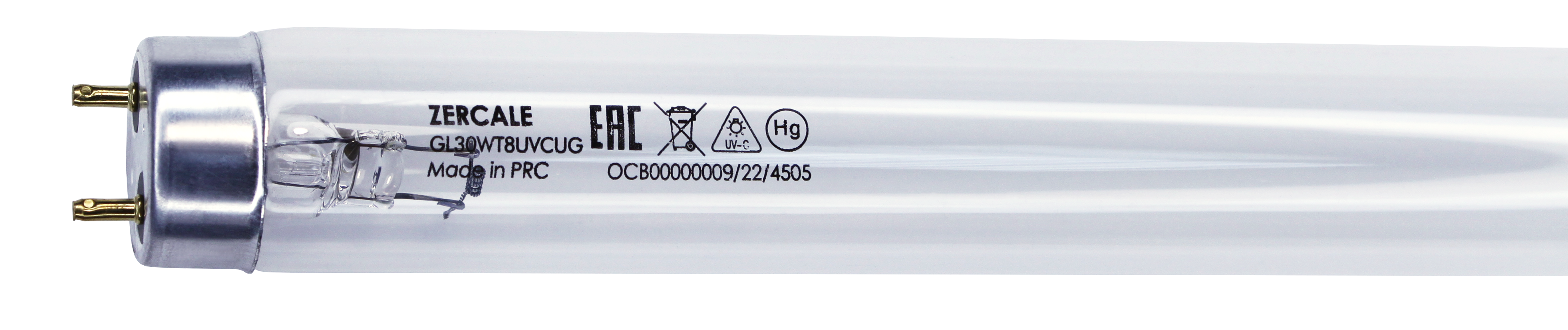 Бактерицидная лампа Zercale Uviol Glass GL30WT8UVCUG серии Uviol Glass (UG) с ультрафиолетовым излучением в области УФ-C (UVC) и пиком интенсивности длины волны 253,7 нм, обладают бактерицидным действием и не образуют озон. Колба лампы изготавливается из увиолевого стекла. Используются в специальных облучателях для обеззараживания воды, воздуха, поверхностей, стерилизации предметов от бактерий, вирусов, плесени, грибков и других микроорганизмов, а также в фотохимических процессах и др.