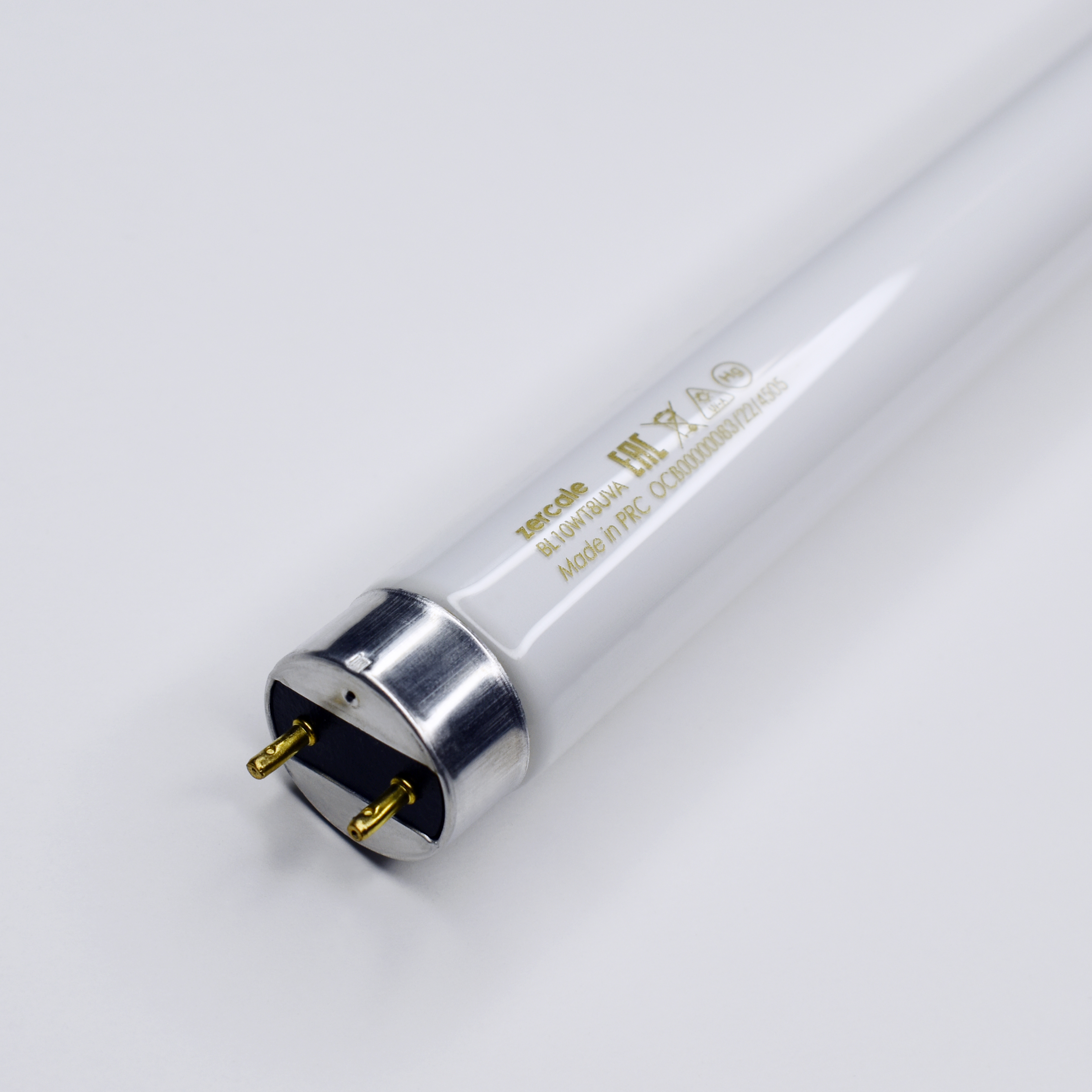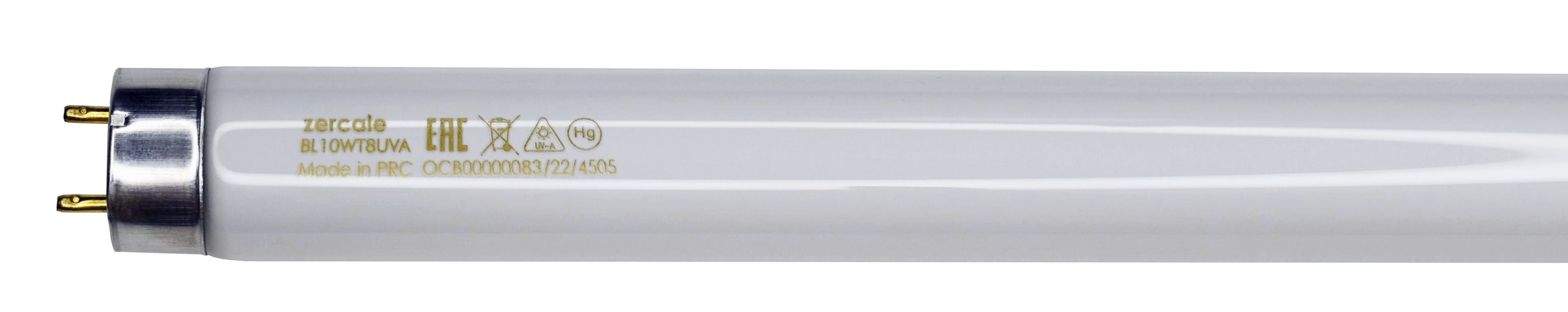 Лампа ультрафиолетовая Zercale BL10WT8UVA Blacklight 10W T8 UVA, G13, 331mm с белым люминофором и видимым синим излучением длиной волны 350-400 нм УФ-А диапазона (UVA BLUE) и пиком интенсивности длины волны 365 нм.